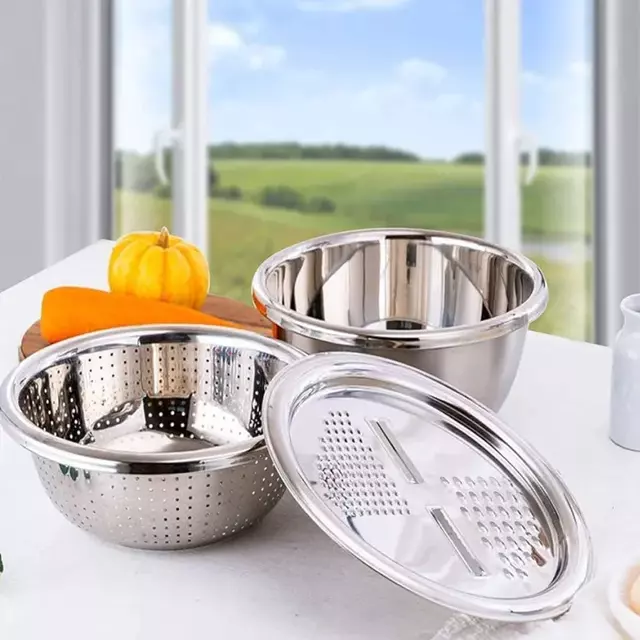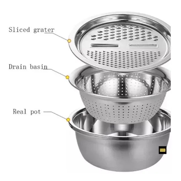 Product Details: 3 in 1 Multipurpose Stainless Steel Grating Basin & Vegetable Cutter 🥒🍅
